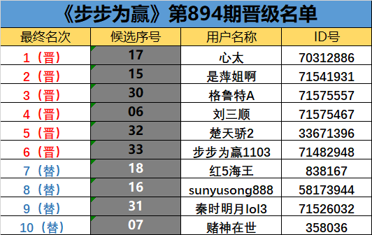 《步步为赢》第894期晋级名单公布
