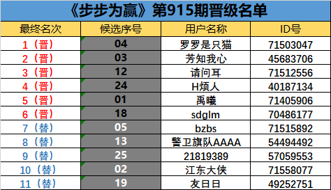 《步步为赢》第915期晋级名单公布