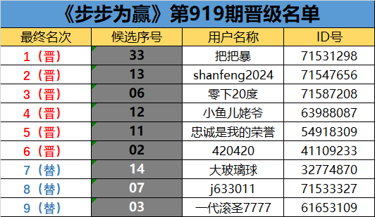 根据2026年1月1日中国福利彩票“双色球”玩法第26001奖结果,《步步为赢》第919期晋级名单已经产生。