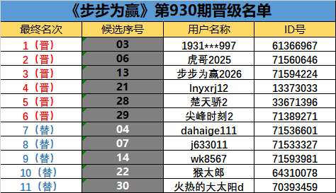 《步步为赢》第930期晋级名单公布